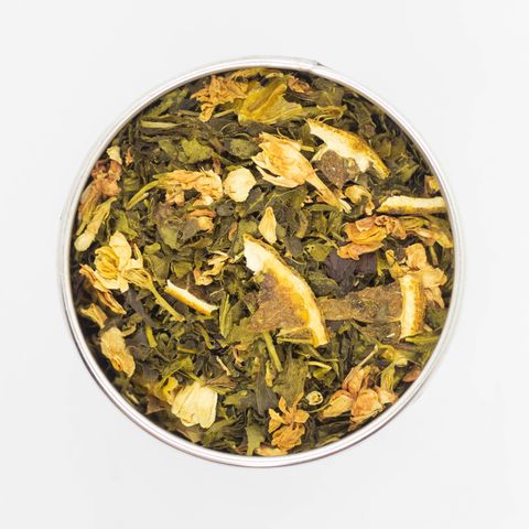 Base de té verde (hebras picadas), cascarillas de naranja y pimpollos de jazmín. Ver más detalles