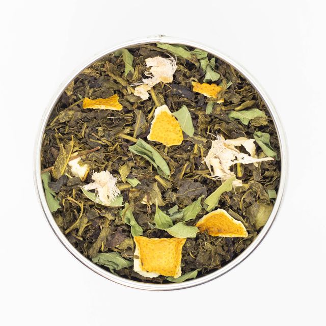 Base de té verde (hebras picadas), piel de limón, hojitas de cedrón y trocitos de jengibre. Ver más detalles