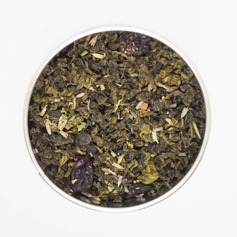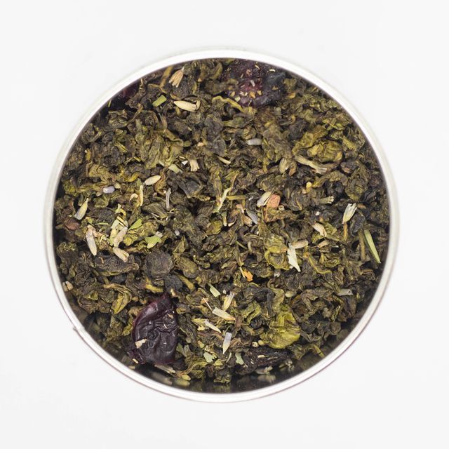 Base de té oolong (hebras enteras enruladas de China), pimpollos de lavanda y arándanos. Ver más detalles